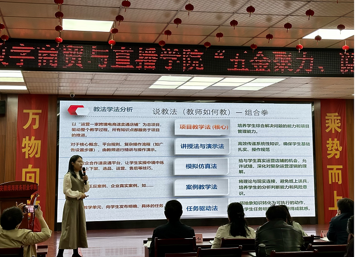 此次 “说课程” 比赛不仅为教师搭建了交流互鉴的平台,更以 “金课程” 建设为导向,推动教师深化课程设计、提升教学能力。未来,数字商贸与直播学院将持续贯彻学校 “五金” 建设战略,深化产教融合,优化课程体系,为培养高质量技术技能人才提供更坚实的支撑。