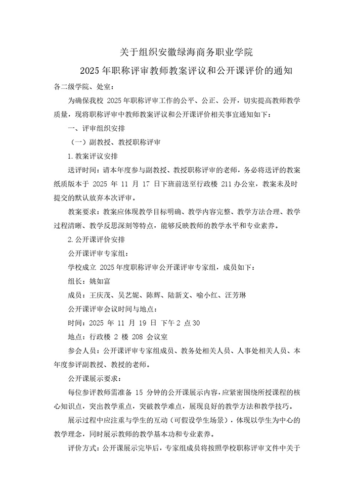 关于组织安徽绿海商务职业学院2025年职称评审教师教案评议和公开课评价的通知