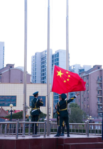 伴随着激昂的《义勇军进行曲》,五星红旗冉冉升起,全体师生肃立注目,高唱国歌,在庄严的国歌声中表达对伟大祖国的无限热爱与崇高敬意。