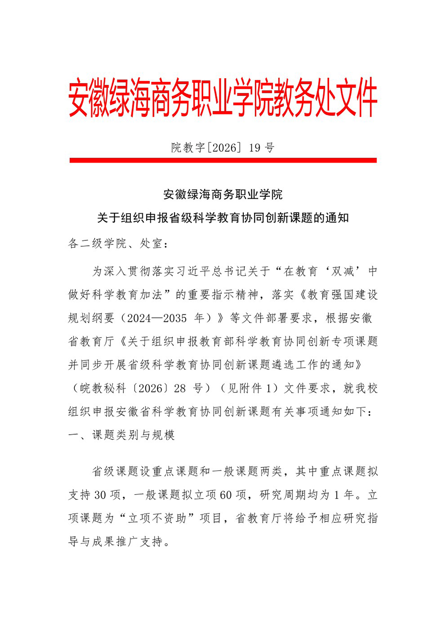 安徽绿海商务职业学院关于组织申报省级科学教育协同创新课题的通知