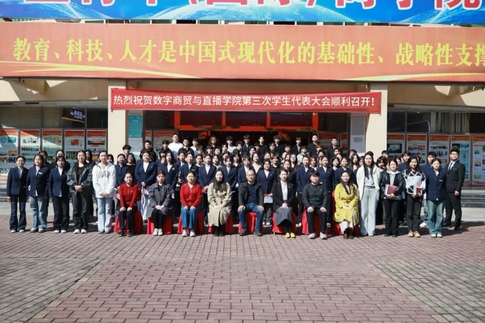 2025年10月24日中午,数字商贸与直播学院第三次学生代表大会在科创馆三楼隆重召开。校团委副书记李红、数字商贸与直播学院党支部副书记孙小林、副院长华夏君,信息工程学院、科学与艺术学院等兄弟学院团总支负责人,以及学院全体辅导员、学生代表、校学生会主席团代表、青年志愿者协会等组织代表出席会议。大会由学院团总支书记钟雪阳主持。
